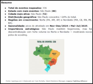 Os dados colacionados ao presente estudo confirmam que o MMA brasileiro constitui hoje um ecossistema pulsante e em expansão. Foram 336 eventos realizados ao longo de 12 meses, espalhados por todas as regiões do país. Embora o estado de São Paulo ainda concentre o maior número absoluto de competições, as regiões Norte e Nordeste já ocupam posição de destaque no calendário nacional, o que reforça a necessidade de estratégias de scouting regionalizado e de maior integração na construção de um circuito profissional. A diversificação geográfica da prática, associada ao volume crescente de eventos, amplia as oportunidades de descoberta de talentos fora do eixo tradicional. Tal dinâmica é confirmada por dados internacionais: em 2025, o programa Contender Series contou com 100 atletas ao longo de 10 episódios; 25 deles eram brasileiros, dos quais 15 haviam passado pelo LFA (Legacy Fighting Alliance), ratificando a importância da liga como principal via de transição do país para o UFC. Esses elementos, lidos em conjunto, indicam um terreno fértil para a consolidação de estratégias comerciais, formativas e regulatórias que valorizem a capilaridade do MMA nacional e ampliem sua presença nos mercados esportivos globais.