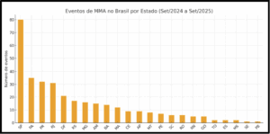 A partir dessa constatação que o presente artigo estruturou uma análise científica e acadêmica inédita sobre oseventos de MMA realizados no Brasil entre setembro de 2024 e setembro de 2025. A iniciativa, além de mapear a frequência e a distribuição territorial das competições, propõe uma leitura estratégica das dinâmicas regionais do setor. Mais do que contabilizar lutas, o estudo oferece uma chave interpretativa para o planejamento futuro da modalidade, cruzando indicadores de prática esportiva com dados de arrecadação estadual e estrutura socioeconômica.