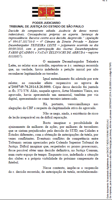 O Tribunal de Justiça de São Paulo, por decisão do Ilmo. Sr. Dr. Desembargador Dacio Tadeu Viviani Nicolau, da 3ª Câmara de Direito Privado, concedeu na última sexta-feira, dia 31 de janeiro, efeito suspensivo  em agravo de instrumento interposto pela Confederação Brasileira de Futebol contra decisão da 42ª. Vara Cível de São Paulo que concedia antecipação de tutela à torcedor da Portuguesa para suspender os efeitos de decisão da Justiça Desportiva.